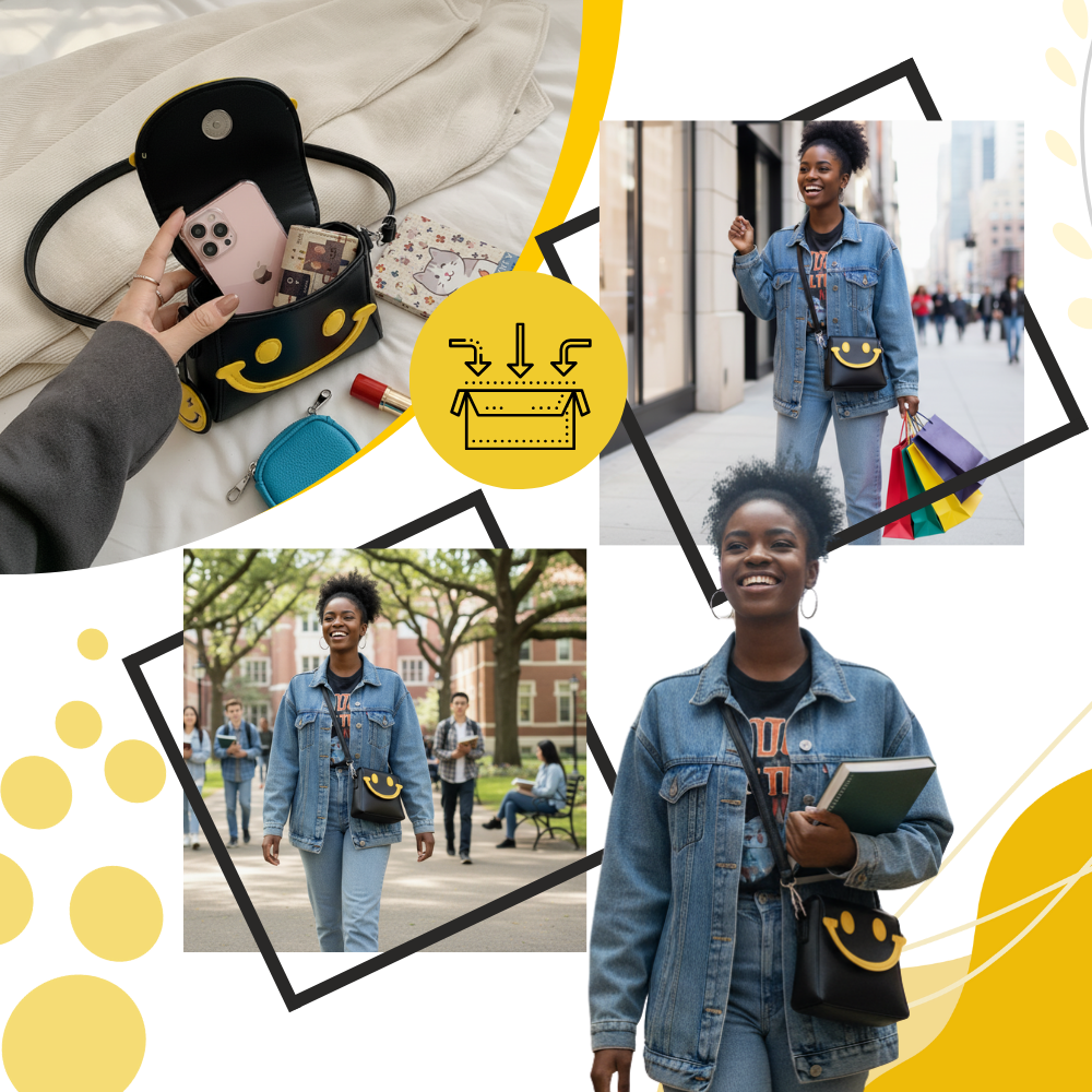 Axelremsväska med ett leende är designad med tanke på vardaglig bekvämlighet och har en justerbar rem som erbjuder en anpassad passform för alla kroppstyper och bärstilar. Oavsett om du föredrar att hänga den avslappnat över ena axeln eller bära den säkert över bröstet, anpassar sig remmen efter din komfort – vilket gör den idealisk för pendling, ärenden och spontana utflykter. Smidiga beslag och robusta metallspännen ger ett säkert grepp samtidigt som de möjliggör snabba justeringar när du är på språng. Det är en väska som rör sig med dig, inte motarbetar dig – byggd för flexibilitet, frihet och för att kunna bäras hela dagen.
