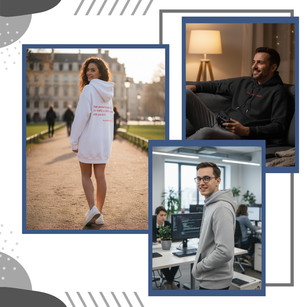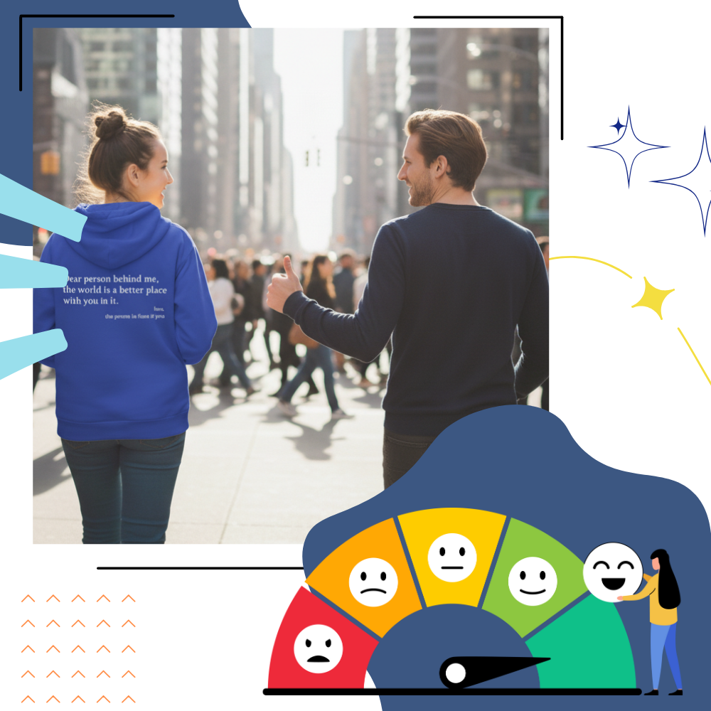 I en värld där så många tyst kämpar mot ångest, depression och självtvivel blir denna hoodie mer än bara ett klädesplagg – den är en tyst handling av medkänsla. I hjärtat av dess design ligger ett subtilt men kraftfullt budskap, som är omsorgsfullt placerat på baksidan av hoodien. Detta är inte bara mode – det är en bekräftelse, inte bara för den som bär den utan för alla förbipasserande som kanske bär på osynliga bördor. Det är ett varsamt sätt att utan ord säga till någon att deras liv är viktigt och att de syns. Denna hoodie sprider värme på mer än ett sätt – den är en mjuk, bärbar påminnelse om att vänlighet är gratis och att du har makten att dela den med världen varje gång du går ut.