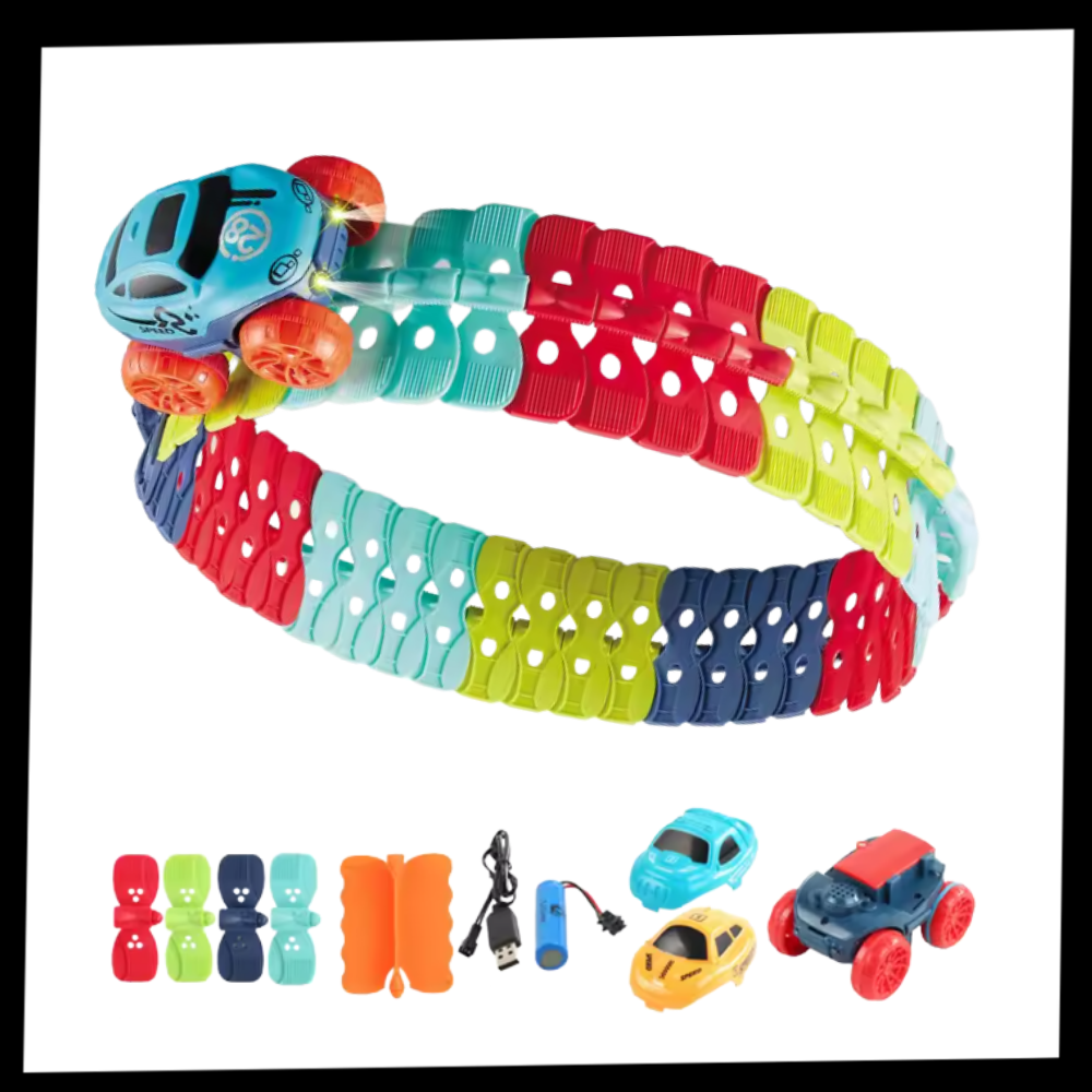 Mini-berg-och-dalbana – Väck ditt barns fantasi med detta spännande racingset med 46 delar! Med flexibla banor, en kraftfull LED-racerbil och utbytbara karosser erbjuder det non-stop racingkul i berg-och-dalbana-stil. är hjärtat i detta racingsets oändliga lekmöjligheter. Varje banbit kan böjas, vridas och kurvas i valfri riktning, vilket gör att barnen kan bygga egna banor som trotsar tråkiga raka linjer. Oavsett om det handlar om att skapa loopar, ramper eller slingrande banor, garanterar flexibiliteten att inga två lopp någonsin blir likadana. Detta håller inte bara barnen engagerade längre, utan stimulerar också deras kreativitet och rumsliga medvetenhet när de löser problem och bygger nya banor varje gång de leker.