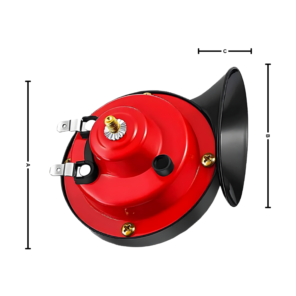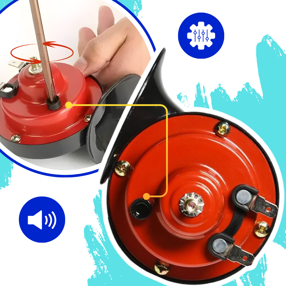 Detta signalhorn har en inbyggd volymjustering som gör att du kan anpassa ljudnivån efter din omgivning. För att justera ljudet vrider du helt enkelt på justeringsknappen med en tång medan signalhornet är anslutet till ström. Oavsett om du föredrar en något dämpad signal för förortsvägar eller full intensitet för motorvägar eller nödsituationer, ger denna manuella kontroll dig kontroll över ljudet – precis när och hur du behöver det.